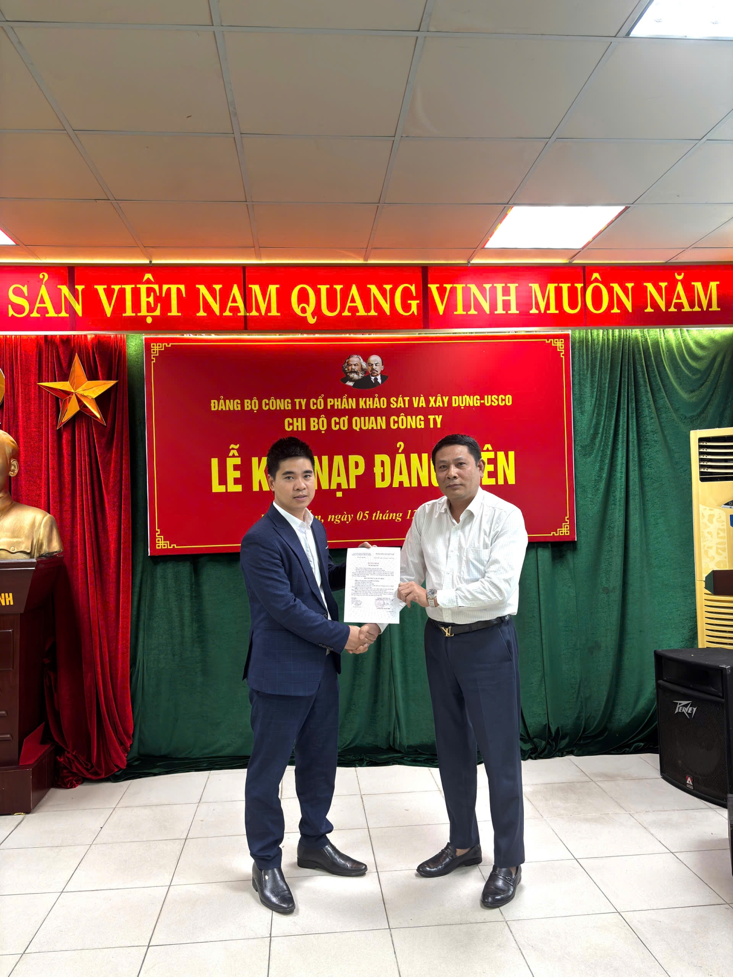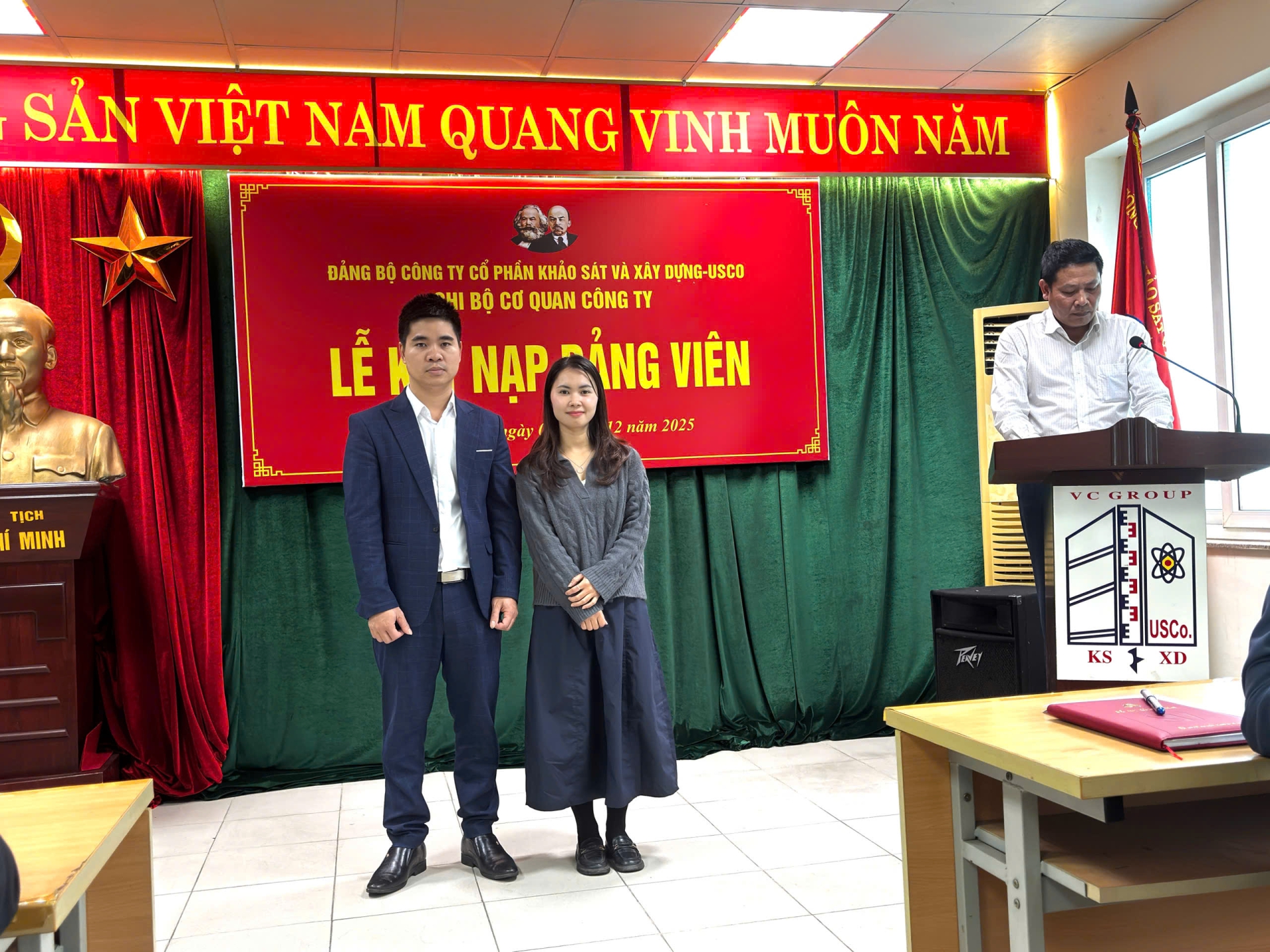 Ngày 05/12/2025, Chi bộ cơ quan Công ty USCO đã trang trọng tổ chức Lễ kết nạp Đảng viên mới cho 2 quần chúng ưu tú là Nguyễn Thị Thanh Thanh và Đỗ Cao Cường sau thời gian rèn luyện, phấn đấu và được tổ chức Đảng tin tưởng, đánh giá đủ điều kiện đứng vào hàng ngũ của Đảng Cộng sản Việt Nam. Buổi lễ được tổ chức trang trọng, đúng quy định của Điều lệ Đảng. Dự buổi lễ có các đồng chí trong Ban chấp hành Đảng bộ Công ty cùng toàn thể đảng viên đang sinh hoạt tại chi bộ cơ quan Công ty.