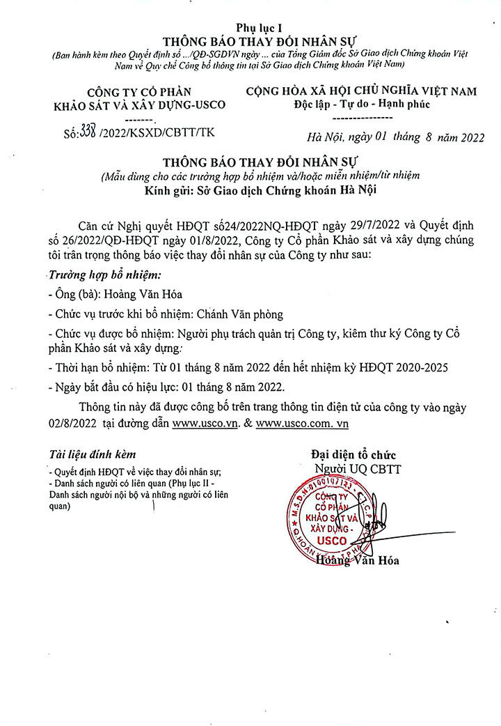 Thông báo về ngày đăng ký cuối cùng để thực hiện quyền chi trả cổ tức năm 202412/09/2025Chốt danh sách chi trả cổ tức_Nghị quyết Chi trả cổ tức_Nghị quyết ĐHĐCĐ_0001 của Công ty cổ phần khảo sát và xây dựng - USCO