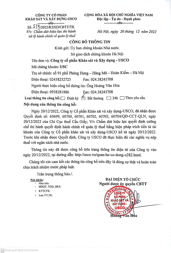 Thông báo về ngày đăng ký cuối cùng để thực hiện quyền chi trả cổ tức năm 202412/09/2025Chốt danh sách chi trả cổ tức_Nghị quyết Chi trả cổ tức_Nghị quyết ĐHĐCĐ_0001 của Công ty cổ phần khảo sát và xây dựng - USCO
