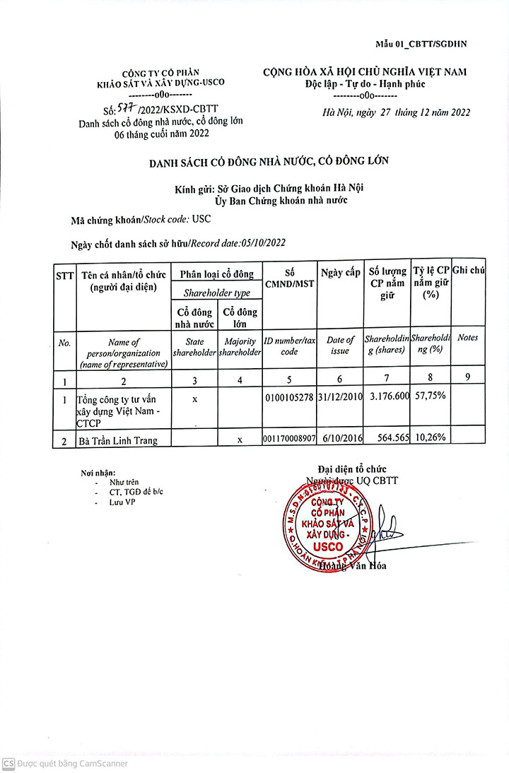 Thông báo về ngày đăng ký cuối cùng để thực hiện quyền chi trả cổ tức năm 202412/09/2025Chốt danh sách chi trả cổ tức_Nghị quyết Chi trả cổ tức_Nghị quyết ĐHĐCĐ_0001 của Công ty cổ phần khảo sát và xây dựng - USCO