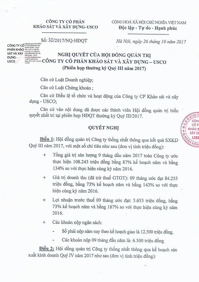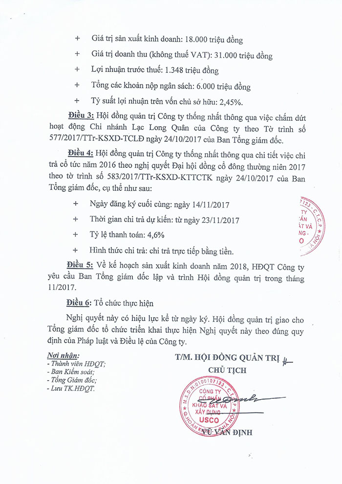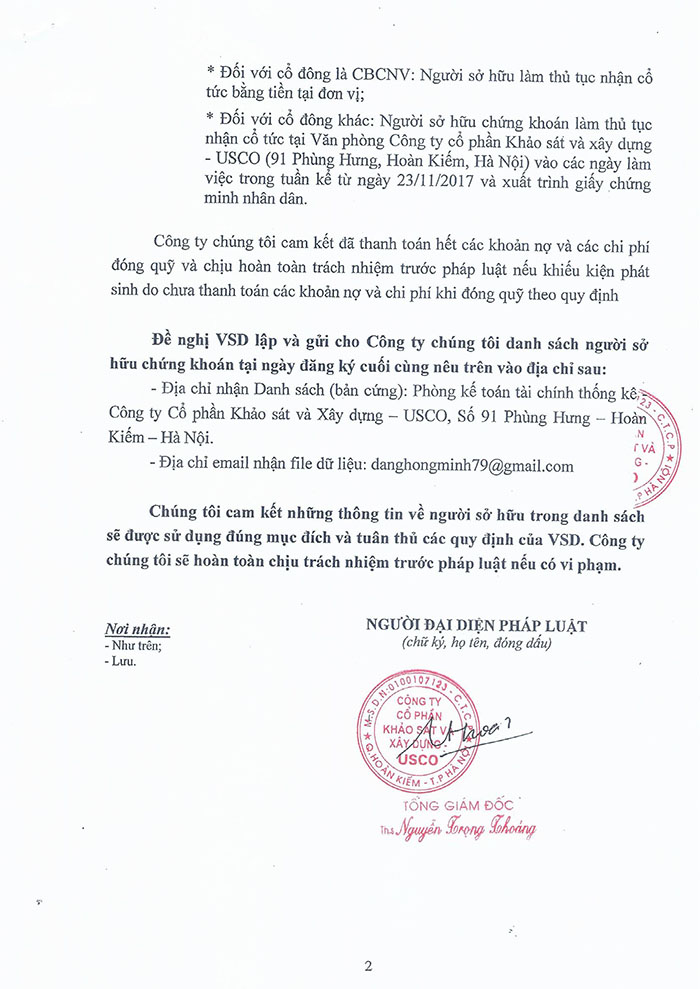 Thông báo về ngày đăng ký cuối cùng để thực hiện quyền chi trả cổ tức năm 202412/09/2025Chốt danh sách chi trả cổ tức_Nghị quyết Chi trả cổ tức_Nghị quyết ĐHĐCĐ_0001 của Công ty cổ phần khảo sát và xây dựng - USCO