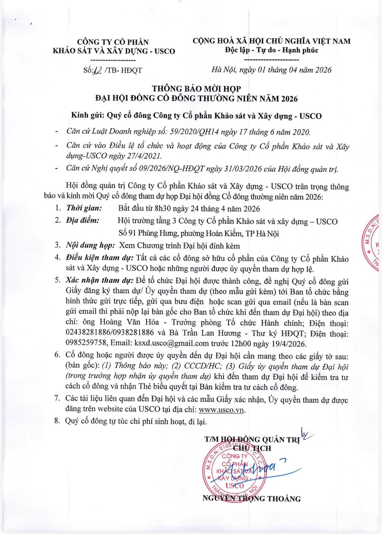 Thông báo về ngày đăng ký cuối cùng để thực hiện quyền chi trả cổ tức năm 202412/09/2025Chốt danh sách chi trả cổ tức_Nghị quyết Chi trả cổ tức_Nghị quyết ĐHĐCĐ_0001 của Công ty cổ phần khảo sát và xây dựng - USCO