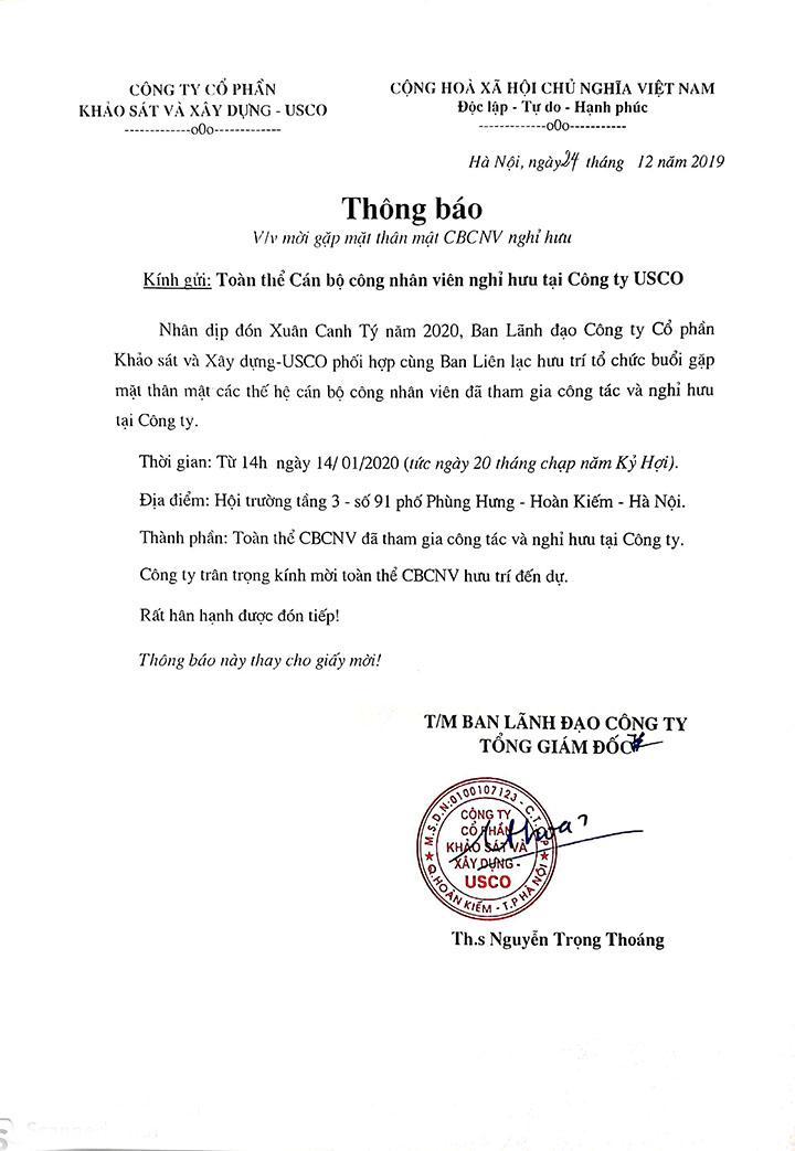 Thông báo mời gặp mặt CBCNV nghỉ hưu tại Công ty nhân dịp Xuân Canh Tý 202032 View|09:25 - 24/12/2019 Chia sẻChia sẻThông báo mời gặp mặt CBCNV nghỉ hưu tại Công ty nhân dịp Xuân Canh Tý 2020