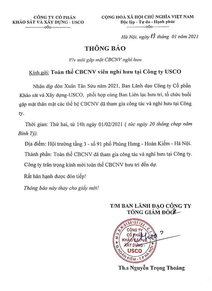 Thông báo mời gặp mặt CBCNV nghỉ hưu tại Công ty nhân dịp Xuân Tân Sửu 202123 View|16:16 - 18/01/2021 Chia sẻChia sẻThông báo mời gặp mặt CBCNV nghỉ hưu tại Công ty nhân dịp Xuân Tân Sửu 2021