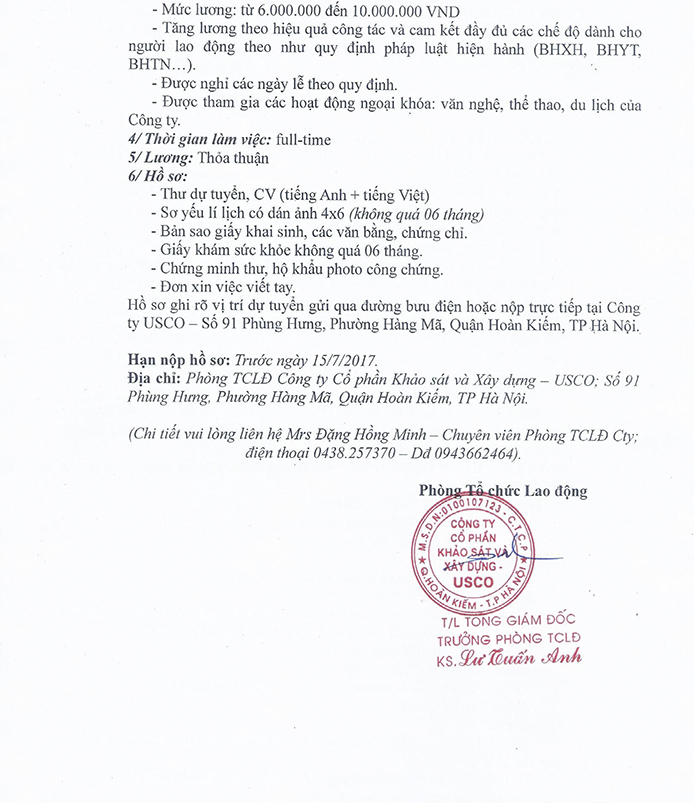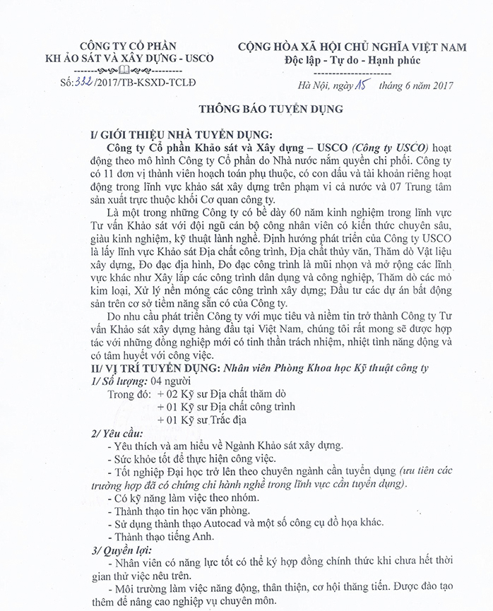Thông báo tuyển dụng46 View|11:07 - 15/06/2017 Chia sẻChia sẻDo nhu cầu công việc và sự phát triển của Công ty Cổ phần Khảo sát và xây dựng - USCO với mục tiêu và niềm tin trở thành Công ty Tư vấn Khảo sát xây dựng hàng đầu tai Việt Nam. USCO thông báo tuyển dụng với các nội dung như sau: