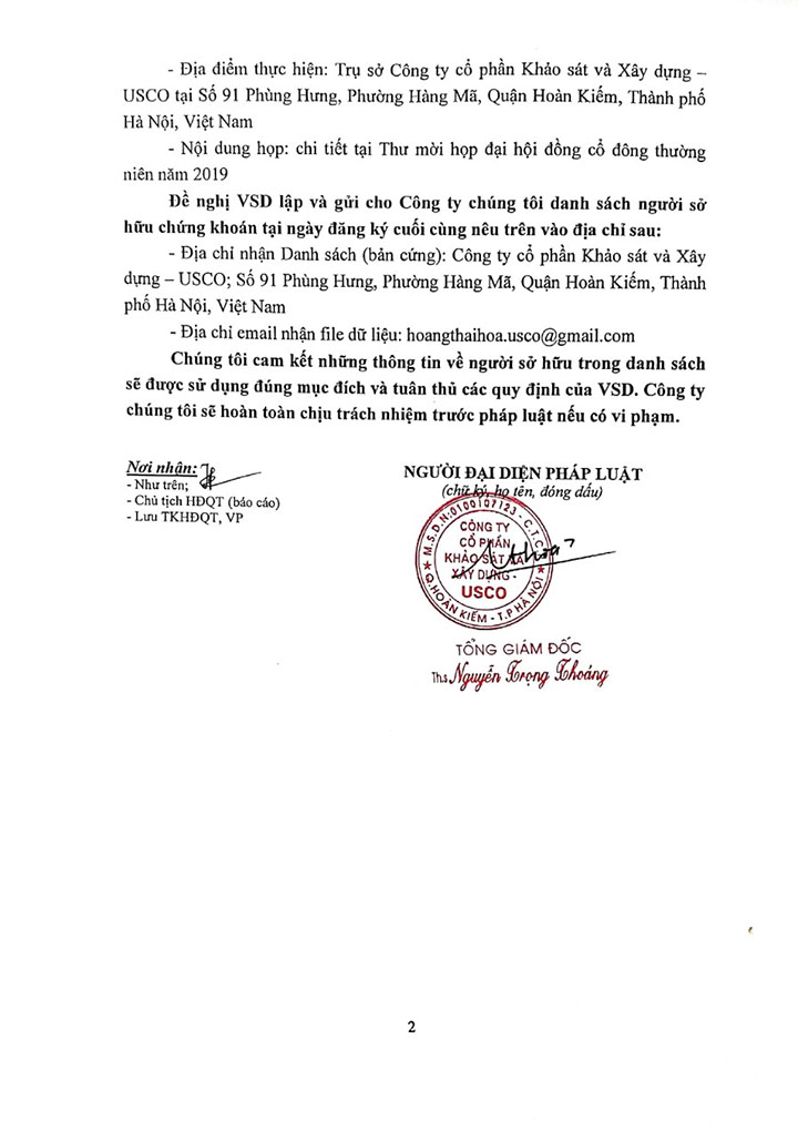 Thông báo về ngày đăng ký cuối cùng để thực hiện quyền chi trả cổ tức năm 202412/09/2025Chốt danh sách chi trả cổ tức_Nghị quyết Chi trả cổ tức_Nghị quyết ĐHĐCĐ_0001 của Công ty cổ phần khảo sát và xây dựng - USCO