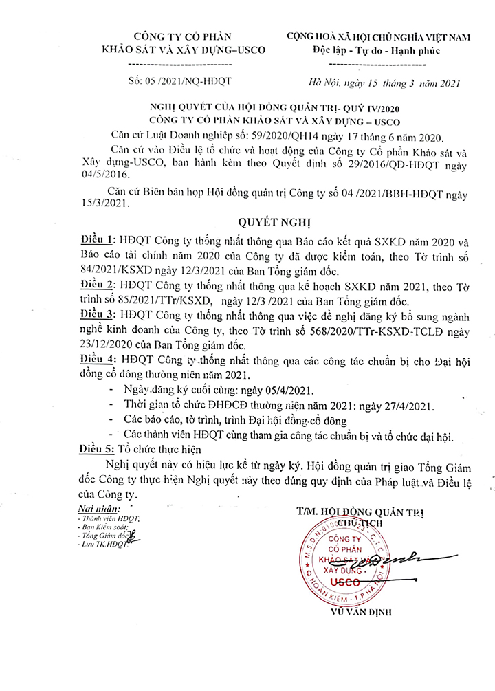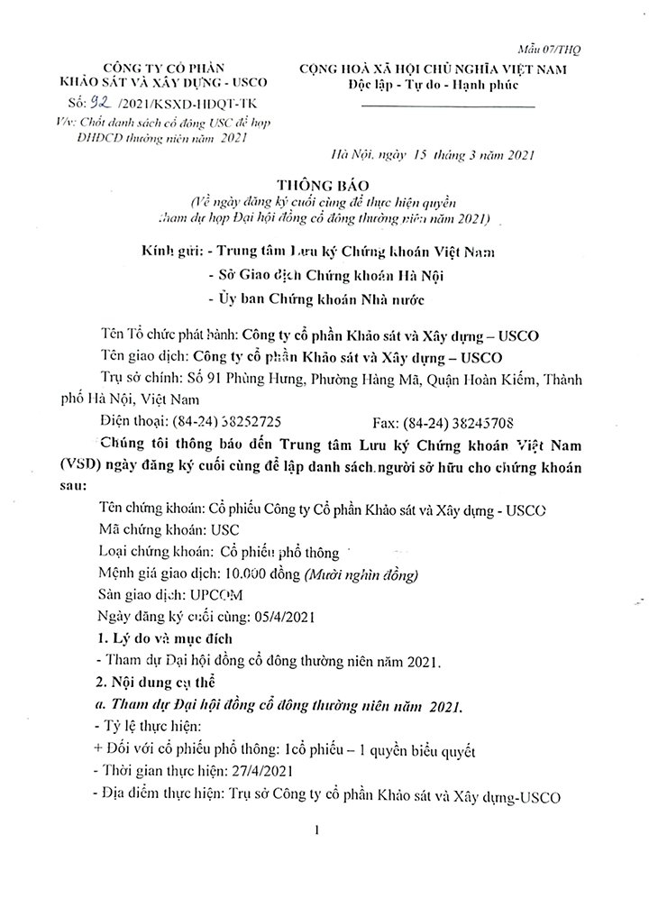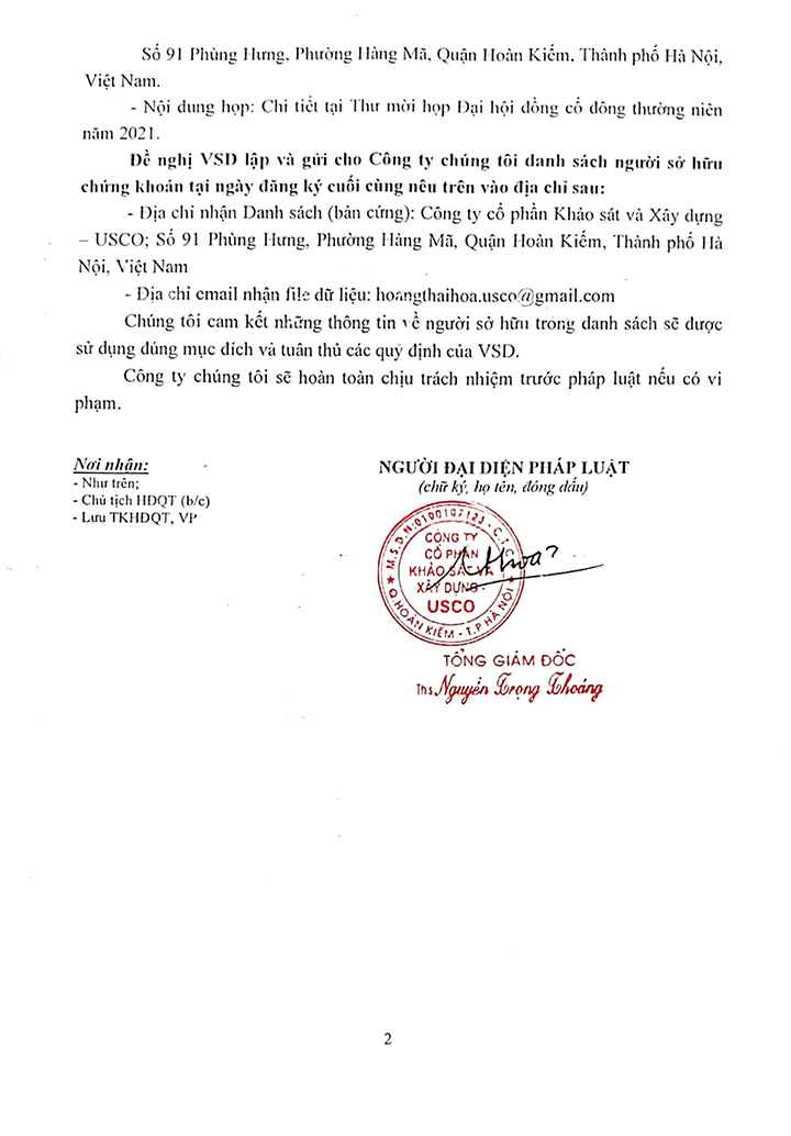 Thông báo về ngày đăng ký cuối cùng để thực hiện quyền chi trả cổ tức năm 202412/09/2025Chốt danh sách chi trả cổ tức_Nghị quyết Chi trả cổ tức_Nghị quyết ĐHĐCĐ_0001 của Công ty cổ phần khảo sát và xây dựng - USCO
