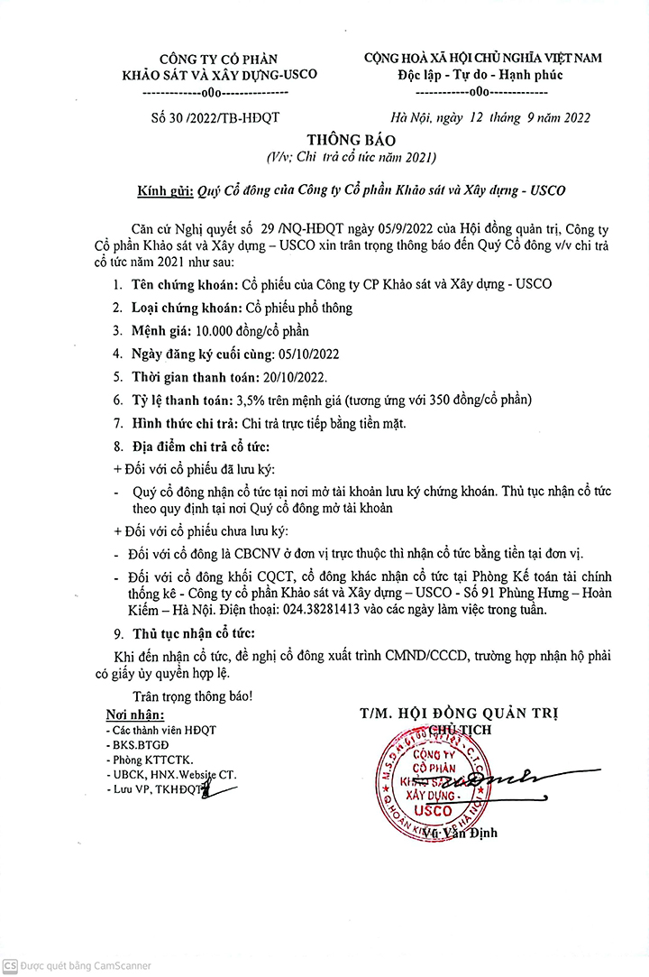 Thông báo về ngày đăng ký cuối cùng để thực hiện quyền chi trả cổ tức năm 202412/09/2025Chốt danh sách chi trả cổ tức_Nghị quyết Chi trả cổ tức_Nghị quyết ĐHĐCĐ_0001 của Công ty cổ phần khảo sát và xây dựng - USCO