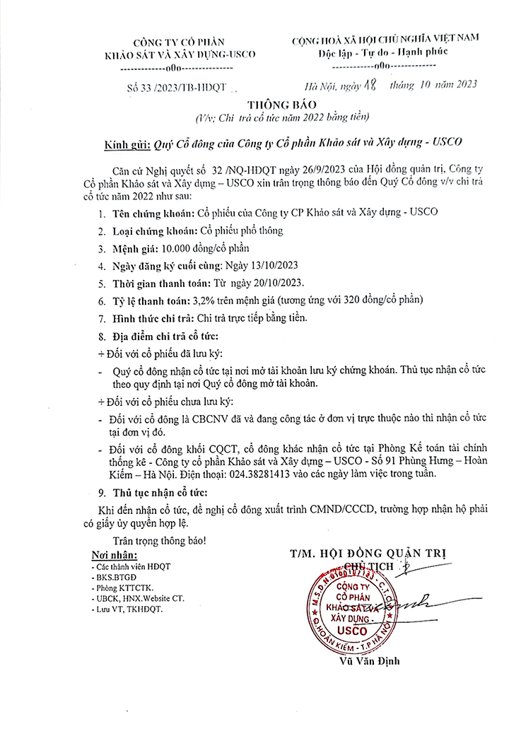 Thông báo về ngày đăng ký cuối cùng để thực hiện quyền chi trả cổ tức năm 202412/09/2025Chốt danh sách chi trả cổ tức_Nghị quyết Chi trả cổ tức_Nghị quyết ĐHĐCĐ_0001 của Công ty cổ phần khảo sát và xây dựng - USCO