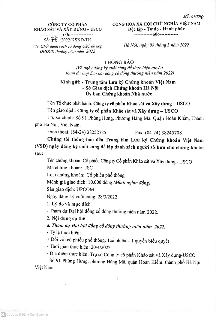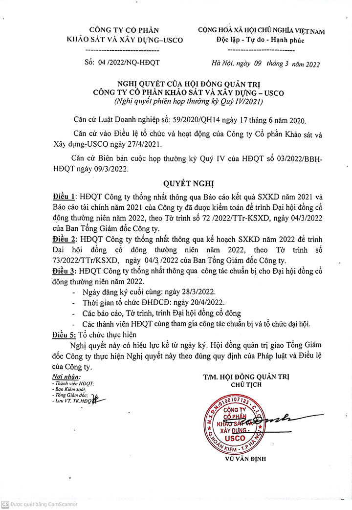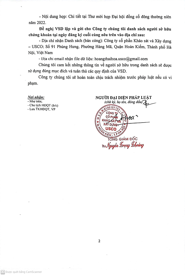 Thông báo về ngày đăng ký cuối cùng để thực hiện quyền chi trả cổ tức năm 202412/09/2025Chốt danh sách chi trả cổ tức_Nghị quyết Chi trả cổ tức_Nghị quyết ĐHĐCĐ_0001 của Công ty cổ phần khảo sát và xây dựng - USCO
