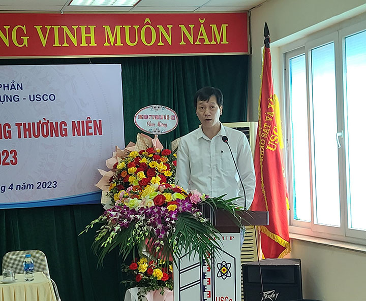 Ông Nguyễn Trọng Thoáng- Tổng Giám đốc Công ty trình bày báo cáo kết quả sản xuất kinh doanh năm 2022 và kế hoạch sản xuất kinh doanh năm 2023, báo cáo tài chính kiểm toán năm 2022, phương án phân phối lợi nhuận năm 2022 và kế hoạch năm 2023.